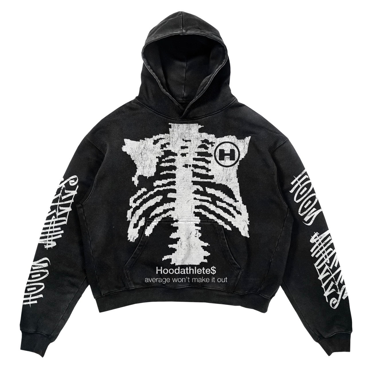 Crafted from heavyweight, washed cotton fleece for a vintage, worn-in feel. Each piece features a bold spine graphic symbolizing backbone and discipline, paired with distressed ink for an authentic, lived-through look. Signature Hoodathlete$ branding and the mantra “average won’t make it out” stamp the message clearly: this isn’t for everyone.